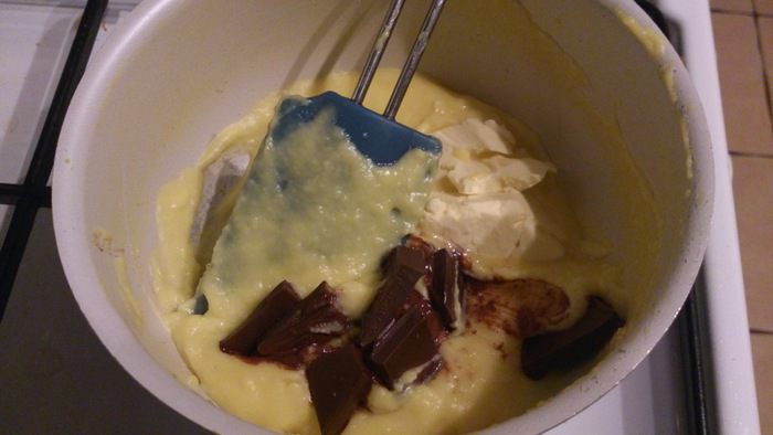 Проварить до загустения и вмешать 20 г масла и 30 г шоколада. Остудить.