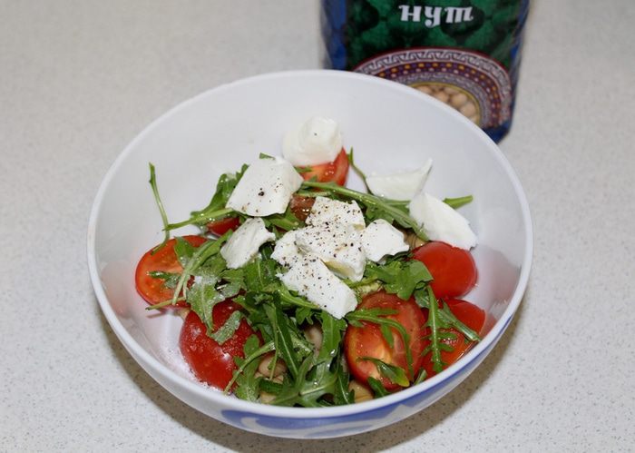 Добавить руколу и моцареллу, посолить, поперчить, полить оливковым маслом.