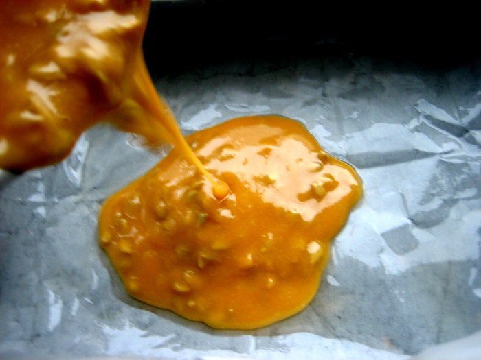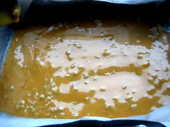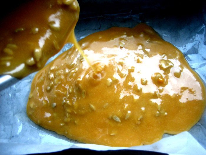 Масса через полчаса поменяла цвет на яркий карамельный цвет! Стелим пергамент в форму, смазываем растительным маслом и выливаем массу.