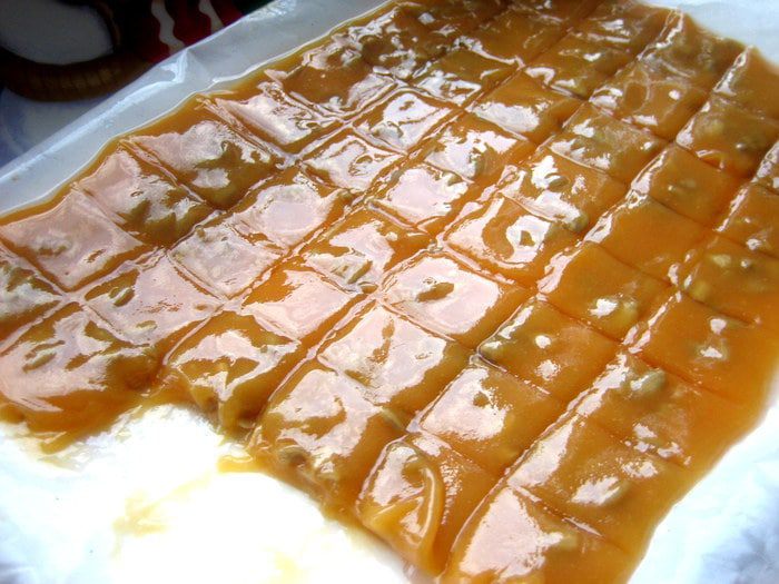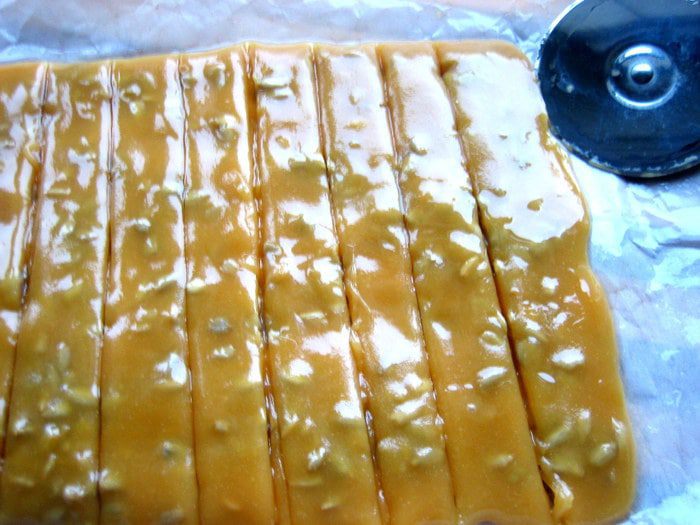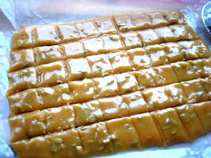Делим схватившиеся тянучки ножом для пиццы, смазав его маслом. Очень удобно!