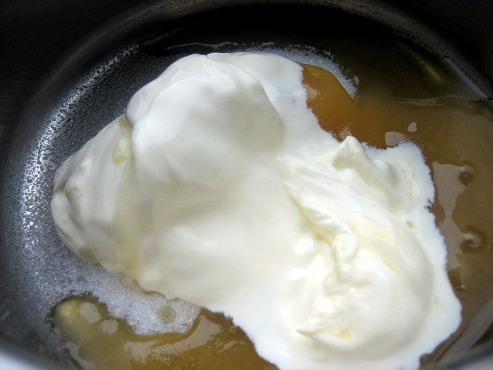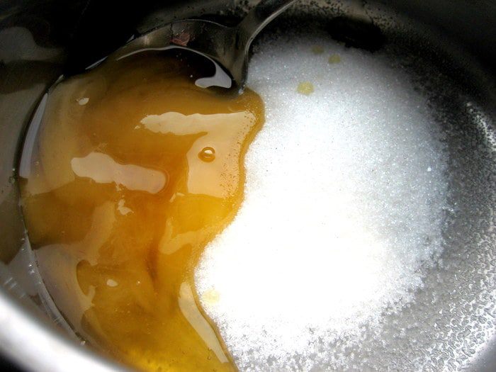 Соединяем сахар с мёдом и ставим на маленький огонь.