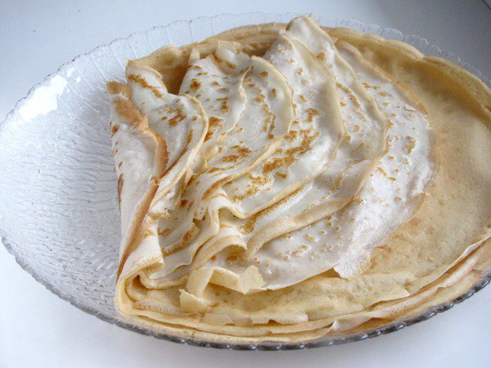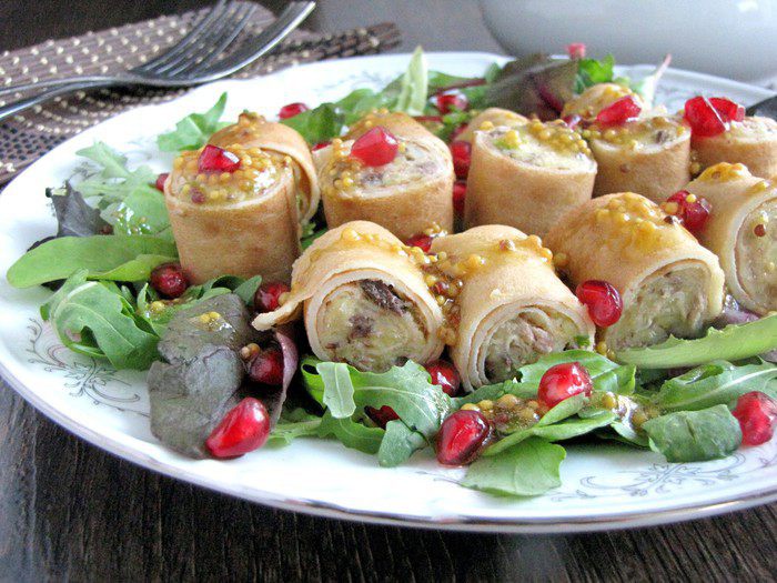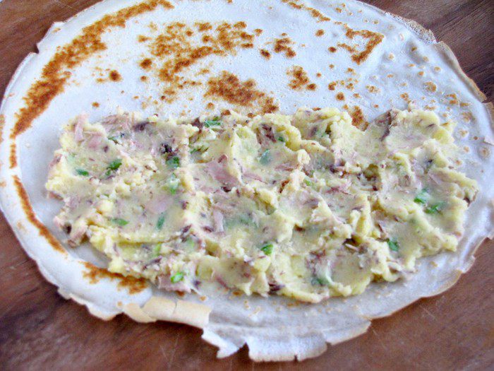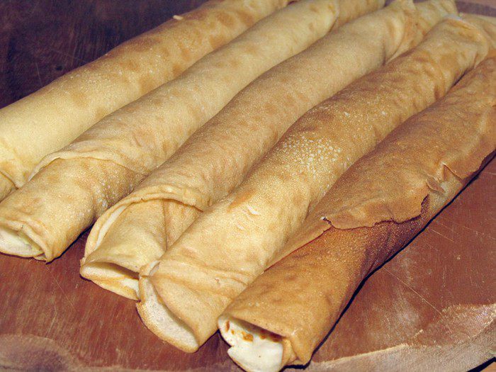Выкладывать по две ст. л. начинки на блинчик и сворачивать в трубочку.