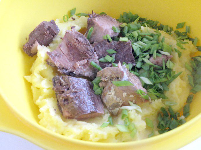 Приготовить картофельное пюре с добавлением молока и сливочного масла. Соединить картофельное пюре с тунцом и зеленым луком. Размять вилкой до однородной массы.
