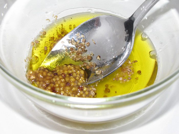 Приготовить заправку. Смешать оливковое масло, лимонный сок горчицу, кориандр, соль и свежемолотый черный перец. Все взбить. Я люблю, чтобы заправки было много, поэтому для данного количества ингредиентов приготовила двойную порцию.)))