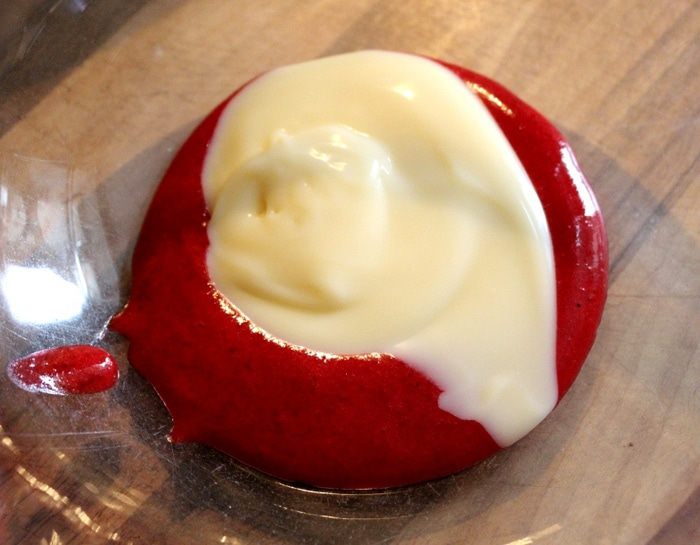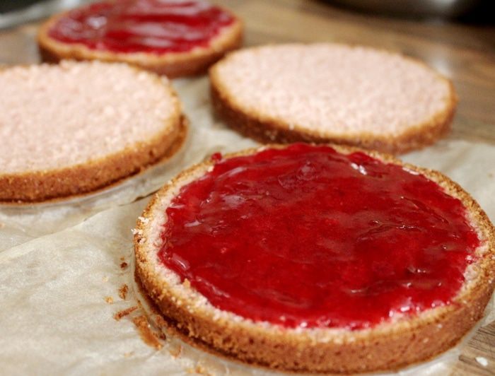 Собираем торт. Для этого на два коржа, промазанных брусникой, промазать толстым слоем крема. Сверху уложить оставшиеся коржи, промазанные брусникой. Оставшимся кремом обмазать верх и бока торта. Убрать торт в холодильник на 20 минут. Затем тыльной стороной чайной ложки нанести бороздки на бока и верх торта. Украсить шоколадными (сахарными) шариками и засахаренной брусникой. Убрать в холодильник на 30-60 минут и торт готов.