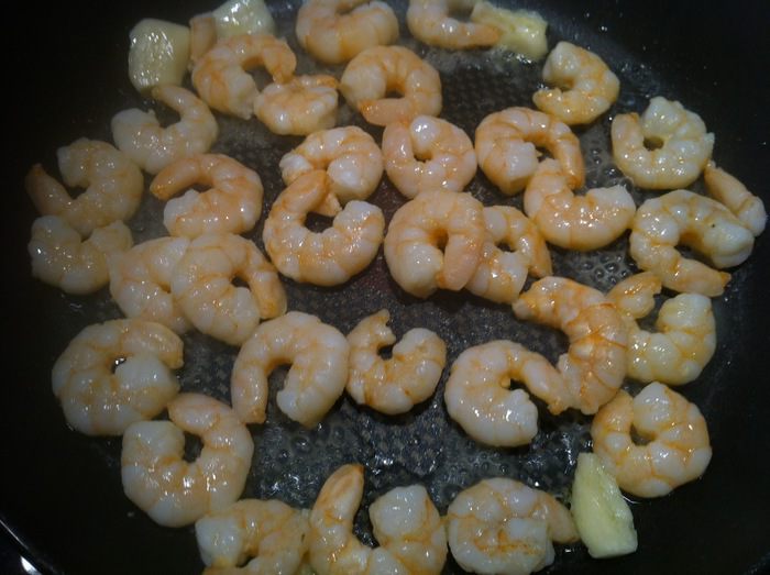 Креветки разморозить, слить лишнюю воду. Если нет времени, то сразу отправить на сковороду с добавлением масла. Лишнюю жидкость слить.
