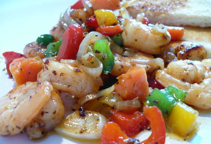 Как только креветки стали закручиваться, добавляем нарезанный перец. Солим, перчим, добавляем прованские травы и ещё масла, чтобы не пригорело.