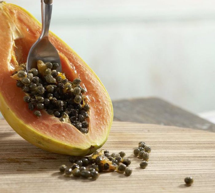 Папайю избавляем от семечек / косточек и режем небольшими кусочками, добавляем в сковороду.