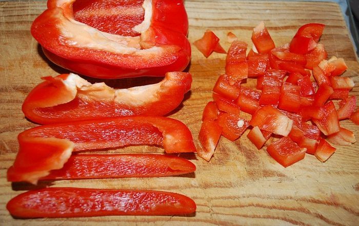 Пока креветки готовятся, быстро избавляем перец от семечек и нарезаем кусочками. Лучше взять несколько кусочков, но разноцветного перца. Будет ярче.