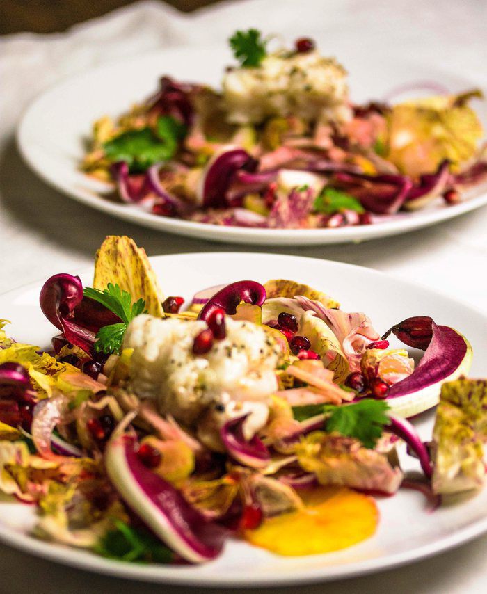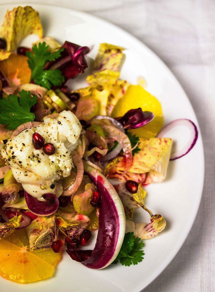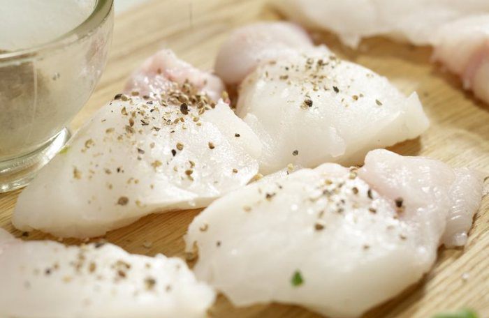 Морского чёрта или другую очень плотную рыбу подготовить, почистить, промыть, обсушить, хорошенько посолить и поперчить. Жаропрочную посуду смазать оливковым маслом, выложить рыбу, побрызгать её оливковым маслом и закрыть фольгой. Отправить в духовку на 15 минут до готовности, затем достать и дать остыть под фольгой.