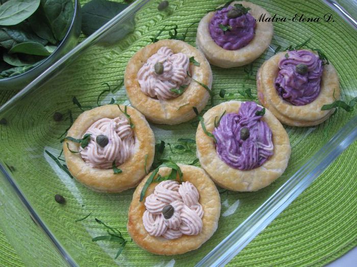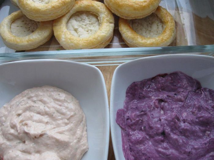 Блендировать смесь из измельченной форели, фетаки, лимонного сока, порезанного мелко укропа, молока до состояния мусса. Разделить на 2 части. Одну - отложить, в другую добавить чернику и блендировать. Поставить 2 миски с муссом в холодильник минут на 30.