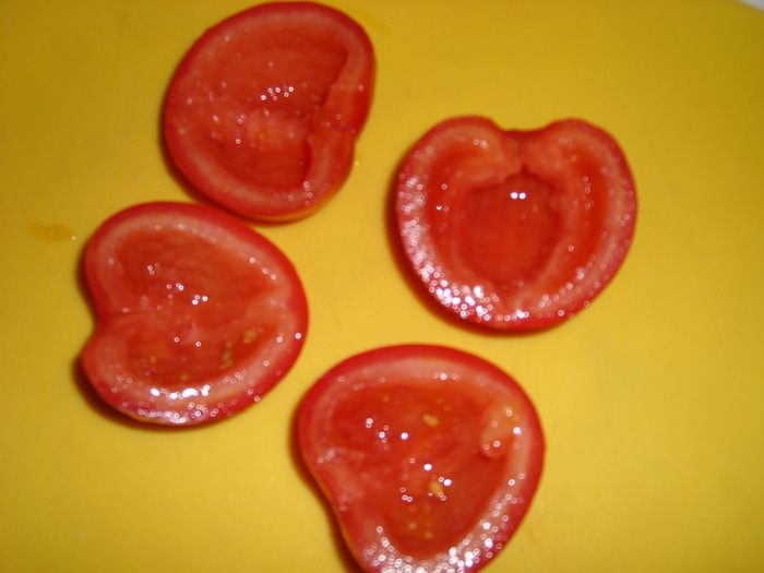 Помидоры разрезать вдоль и чайной ложкой вынуть сердцевину.