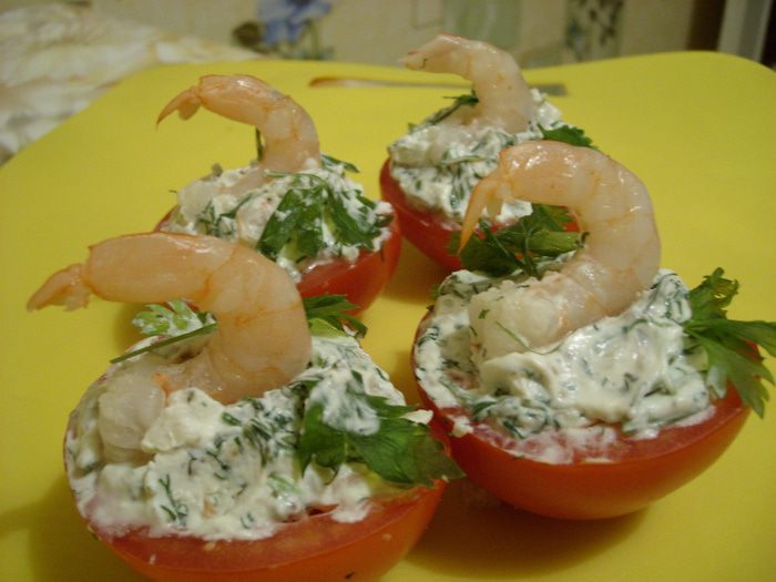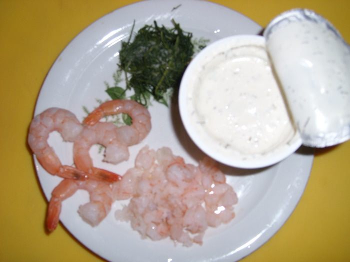 Креветки почистить, мелко порубить, добавить укроп, натёртый сыр, грецкий орех (порубить ножом), сметану, горчицу и соевый соус. Тщательно перемешать.