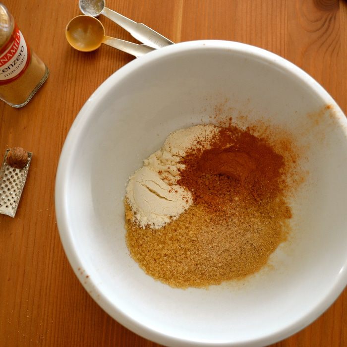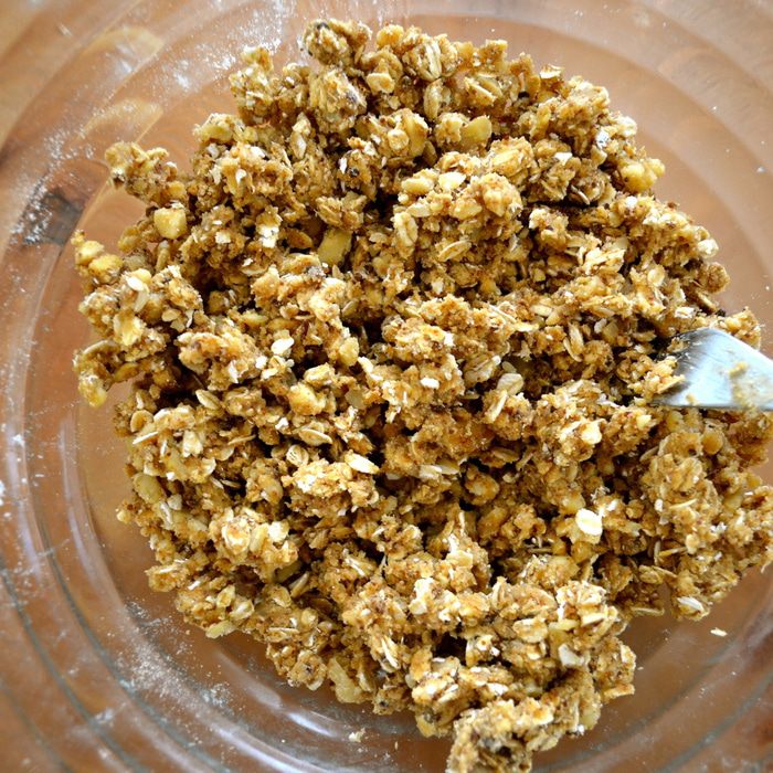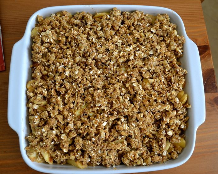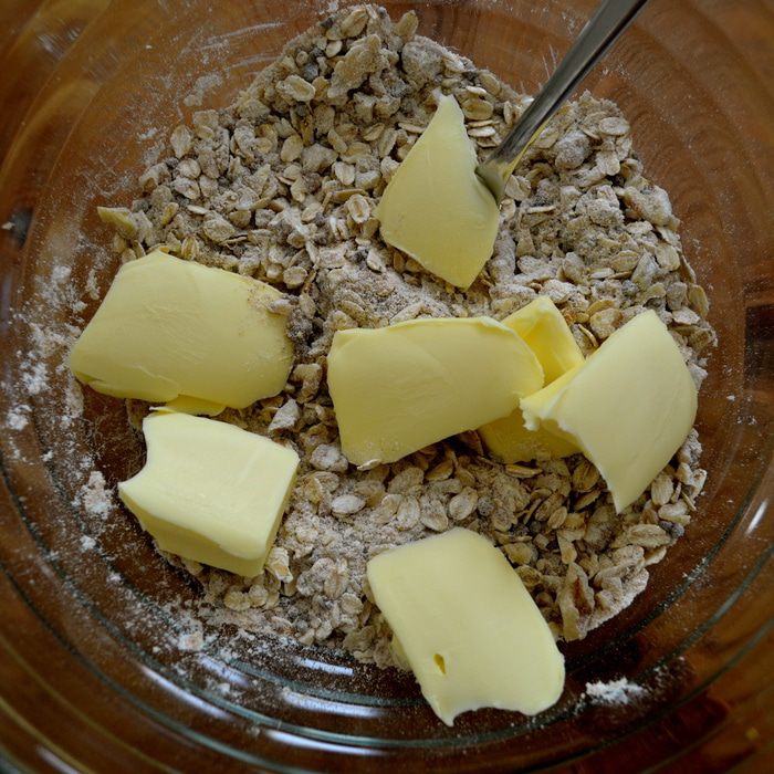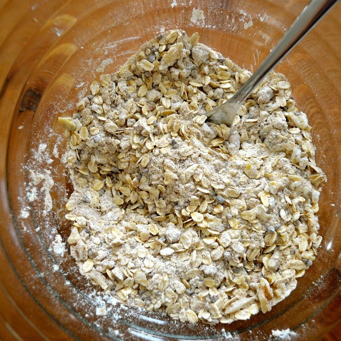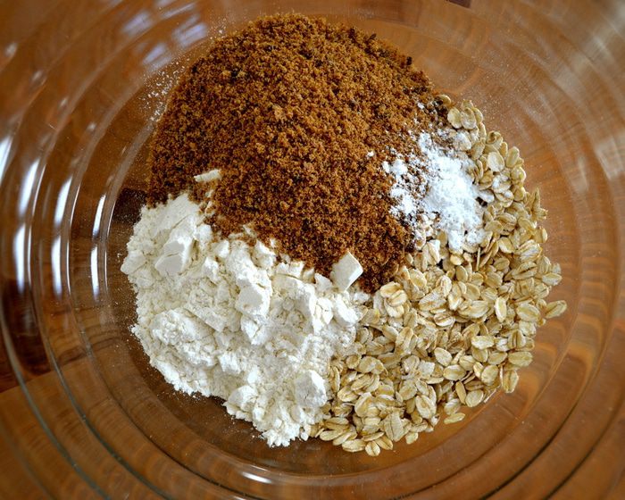 Духовку включить на 180°С. Для присыпки десерта смешать овсяные хлопья, муку, прессованный тростниковый сахар и соду.