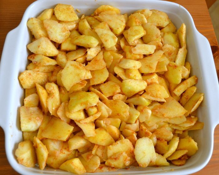 Добавить смесь из сухих ингредиентов к яблокам и как следует перемешать.
