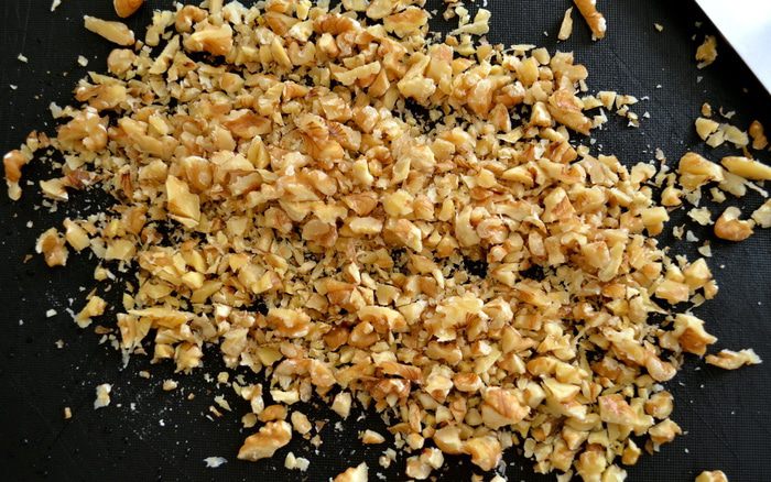 Орехи (лучше всего миндаль, но можно смело заменить на грецкие или пекан; в моем случае - грецкие) порубить...