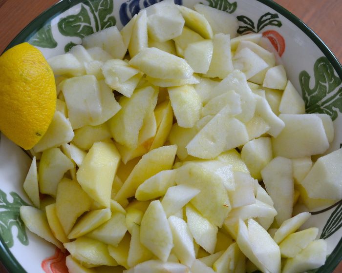 Яблоки помыть, очистить от кожуры и нарезать произвольно небольшими кусочками. Смочить соком половины лимона.