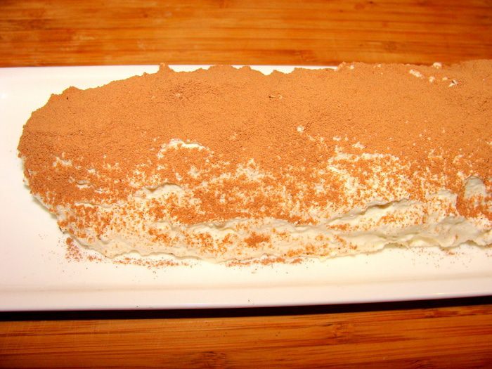 Посыпать порошком какао через ситечко. Вместо какао-порошка можно полить растопленным шоколадом или смешать сметану с сахаром и какао, также растопленными на огне. Сверху посыпать орешками.