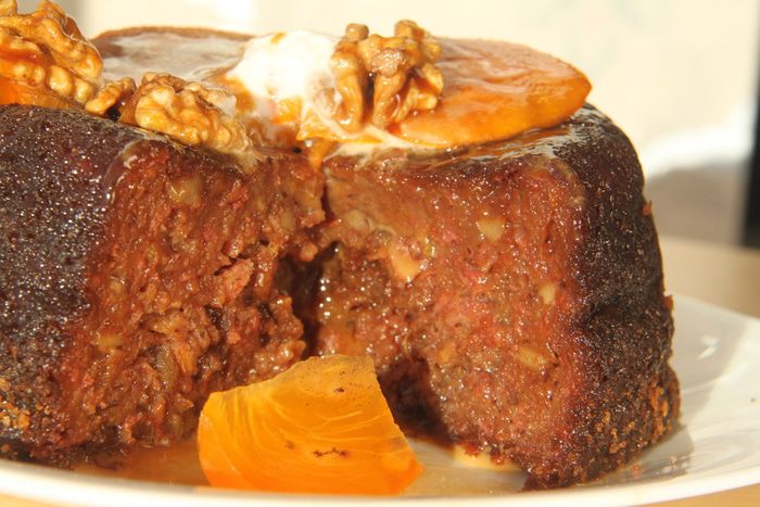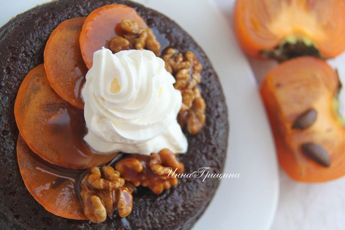 Остывший пудинг перевернуть на блюдо, по желанию украсить дольками свежей хурмы и карамелизированным орехом. Подавать со взбитыми сливками.