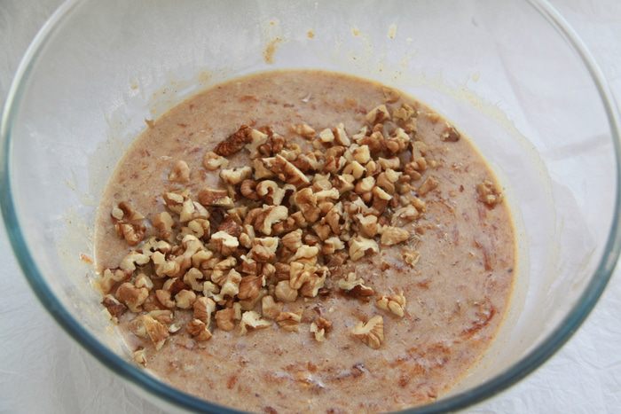 Соединить сухие и влажные ингредиенты, добавить крупно порезанные грецкие орехи (или пекан), перемешать.