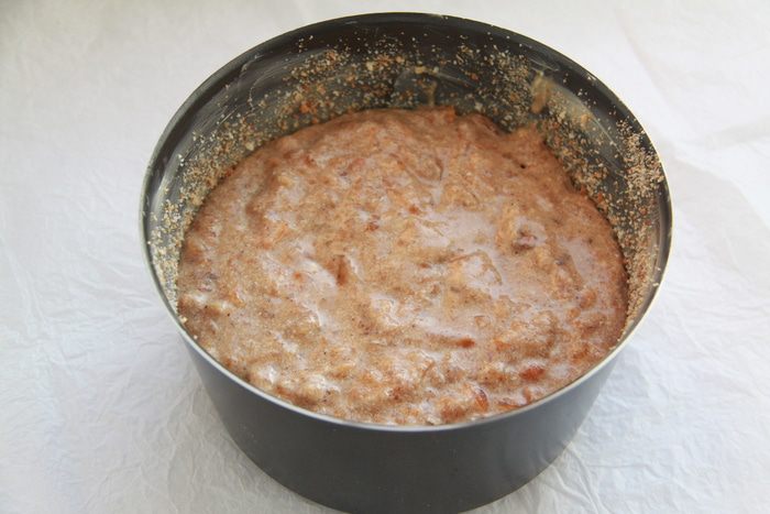 Подготовить форму для пудинга: смазать маслом, присыпать бисквитной крошкой. Вылить тесто в форму. Выпекать при 180*С примерно 50 минут. Дать пудингу полностью остыть (желательно в выключенной духовке при открытой дверце).
