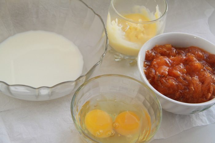Соединить молоко, яйца, размягчённое масло и хурму.