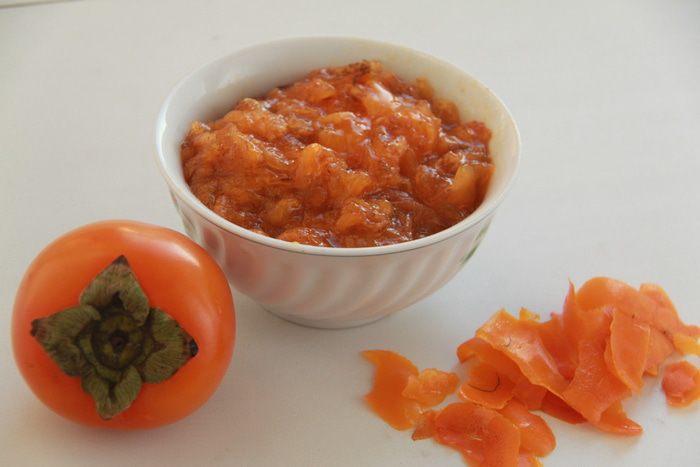 Хурму очистить от кожицы и семян. Мякоть размять вилкой. Из двух очищенных хурмушек у меня получилось 320г пюре.