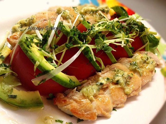 Малое куриное филе под соусом гуакамоле с салатом из помидоров и авокадо