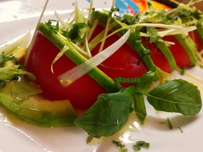 На тарелку выкладываем помидор и авокадо сверху укладываем лук порей. Поливаем все оливковым маслом и посыпаем измельченными листьями базилика и кориандра.