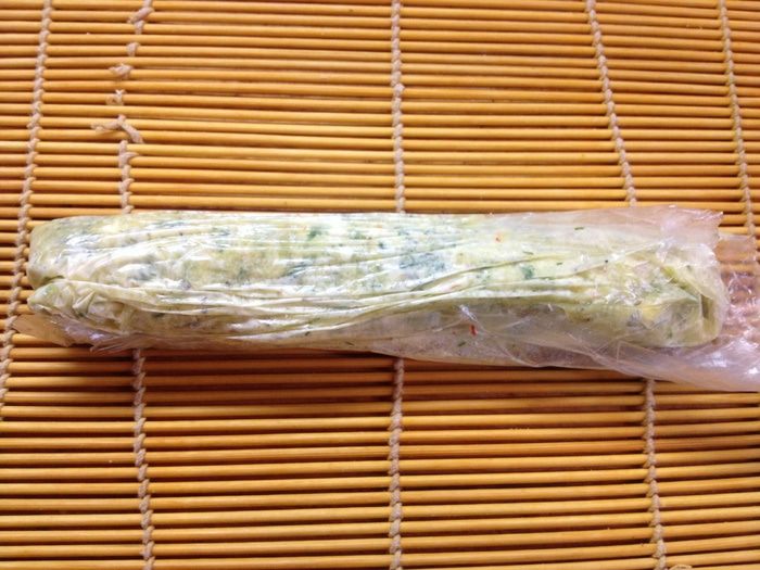 Добавляем измельченный листья петрушки и кориандра и мелко порезанный острый перец и 1/6 часть помидора. Перемешиваем с добавлением соли. Затем все складываем в пакет и убираем в морозильную камеру.