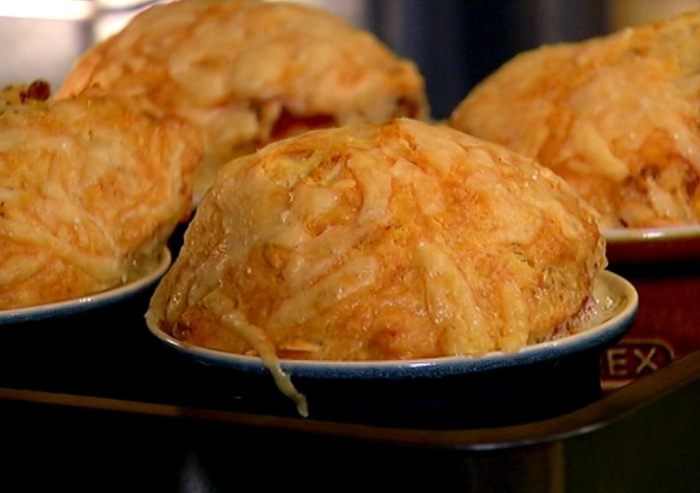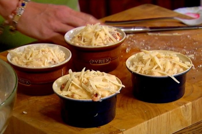 Небольшие керамические формочки для маффинов смазать оставшимся оливковым маслом, разложить в них тесто и посыпать сверху оставшимся сыром.