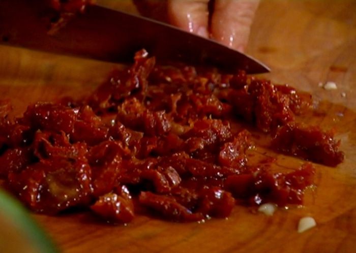 Если нет вяленых помидоров в масле, можно использовать сухие, подойдут также оливки или маслины.