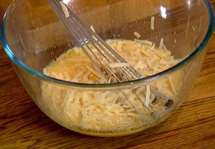 Яйца разбить в глубокую посуду, влить вино и 100 мл оливкового масла, добавить натертый сыр (немного оставить), посолить, поперчить и перемешать.