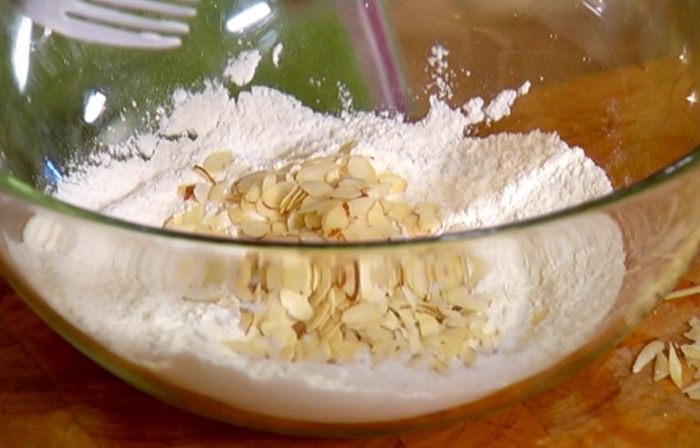 Муку перемешать с разрыхлителем и миндалем.