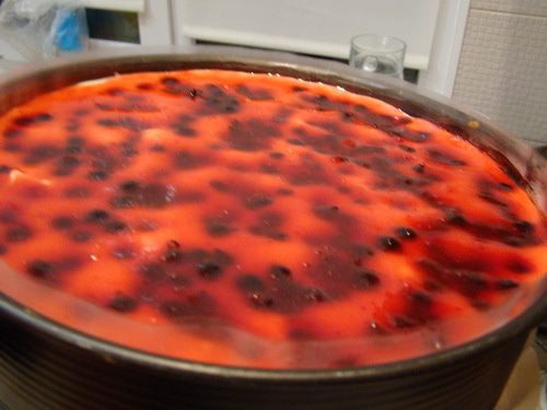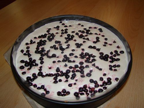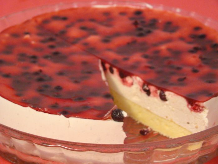 Выливаем суфле на бисквит, заключенный в тортовое кольцо, сверху укладываем тонким слоем ягоды, слегка вдавливая. Ставим в холод.