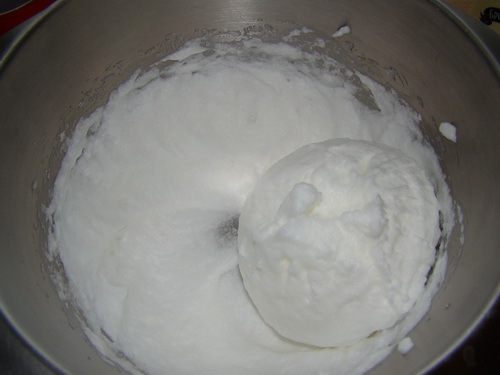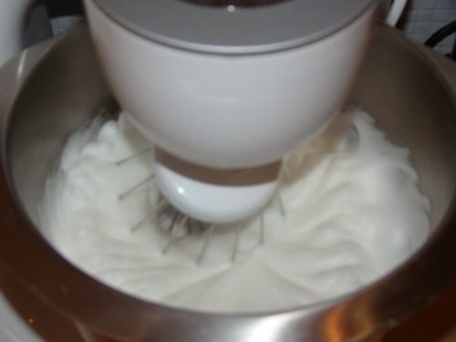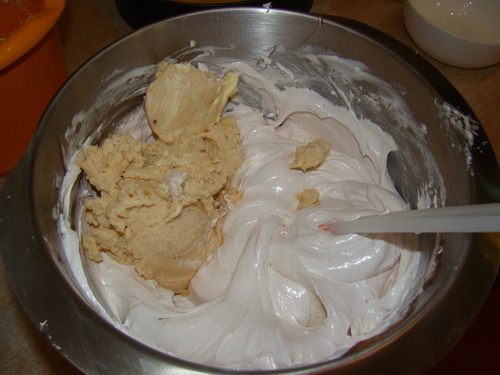 Снижаем скорость миксера. Тонкой струйкой вливаем еще горячий сироп.