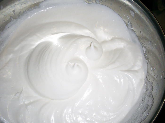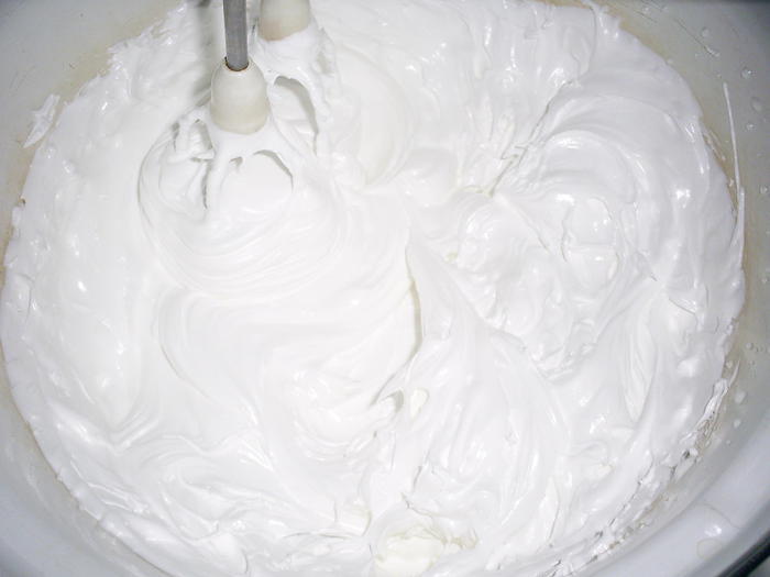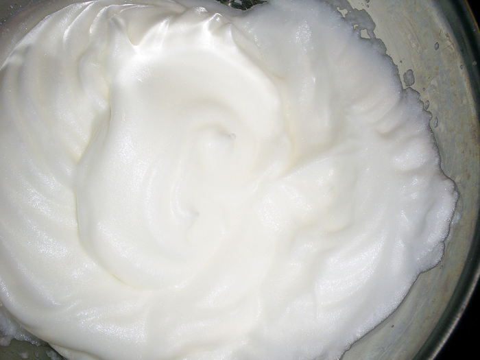 Итак, приступим. Оставшиеся два белка, сахар и лимонную кислоту помещаем в небольшую кастрюльку. Взбивать крем мы будем на водяной бане. К этому времени вода в большей кастрюле уже кипит. Кастрюля с белками должна плавать в кипящей воде. Начинаем взбивать. Постепенно белки нагреваются, сахар и кислота растворяются и у нас получается гладкая, пышная блестящая масса. Как долго взбивать, зависит от того, что вы собираетесь этим кремом угощать. Для выравнивания торта крем достаточно взбивать минут 10. Если же вы хотите сложных рельефных украшений, то взбиваем подольше, пока крем не начнет наматываться на венчики. В нашем случае это не обязательно.