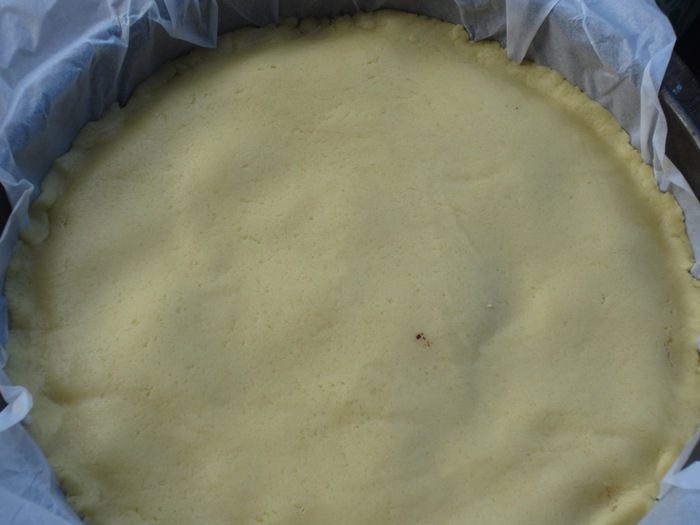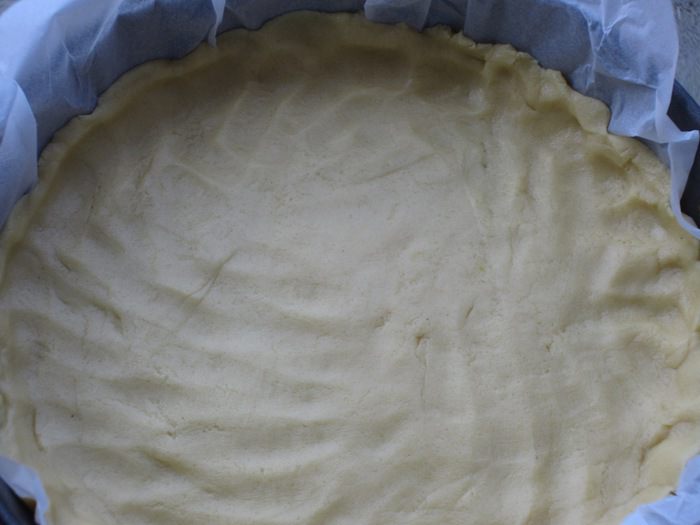 Тесто разделить на 2 части.Раскатать одну часть теста и выложить в форму с пергаментом.