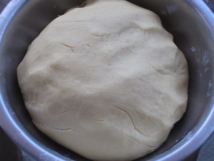 Добавить сливочное масло ,просеянную с разрыхлителем муку,щепотку соли и замесить тесто.Сформировать шар,завернуть в пищевую плёнку и положить в холодильник на 1 час.