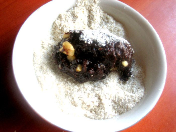 Примерно чайную ложку "теста" окунаем в пудру, молотые вафли или крошку печенья.