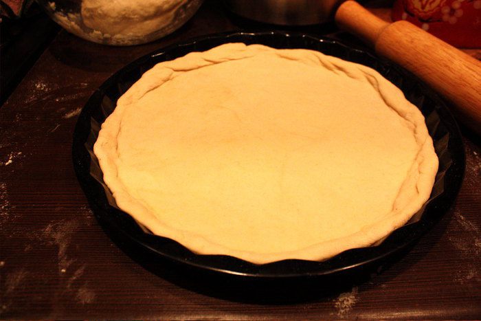 Кладем пласт в круглую форму для пирогов либо на противень, смазанный маслом и посыпанный мукой.