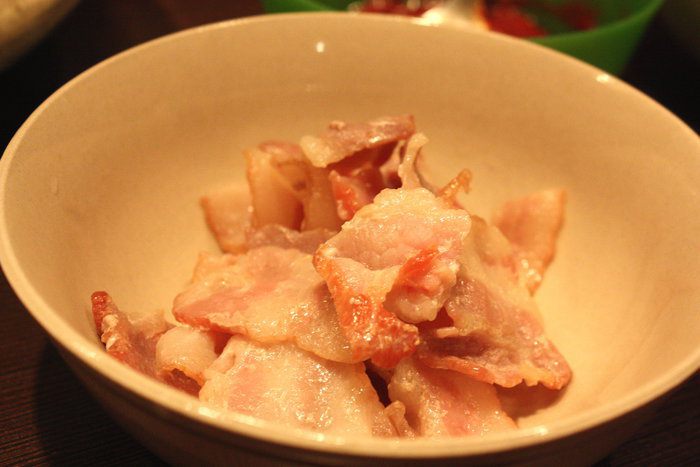 Тем временем, поджариваем бекон до средне-золотого состояния.