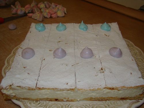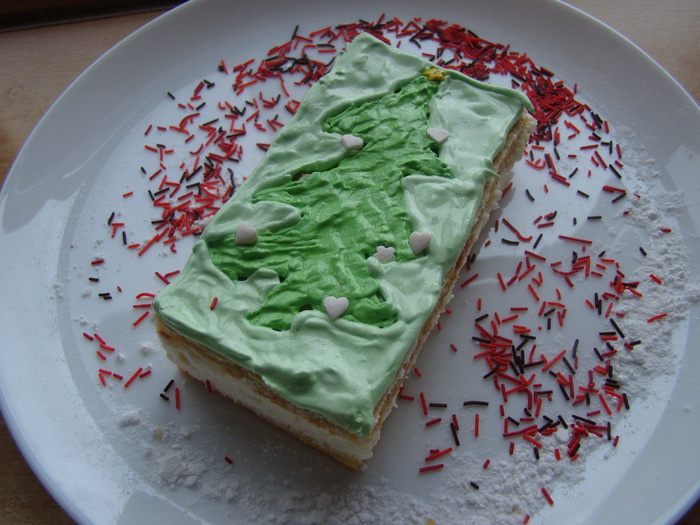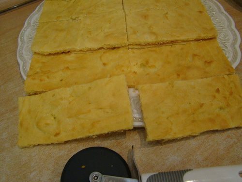 Подравнять края, положить один корж на другой, разрезать ножом для пиццы на 8 прямоугольников.