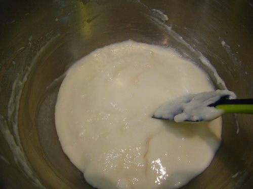 Вбивать по одному яйца, размешать быстро до однородной гладкой и блестящей массы.