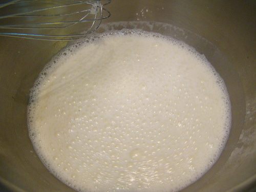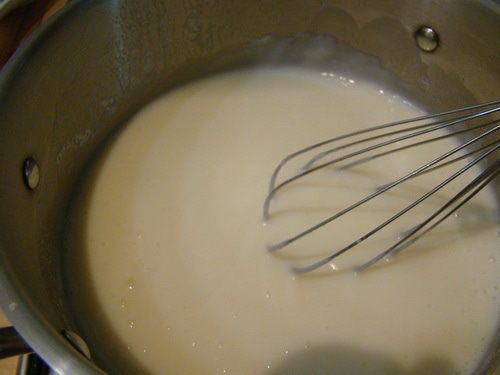 Горячее молоко вливаем в муку с холодным молоком, размешиваем, возвращаем обратно на огонь.