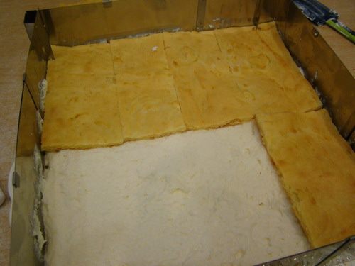 Сборка пирожных. Выложить первый корж, начинку, второй, слегка придавить. Поставить в холод на несколько часов.