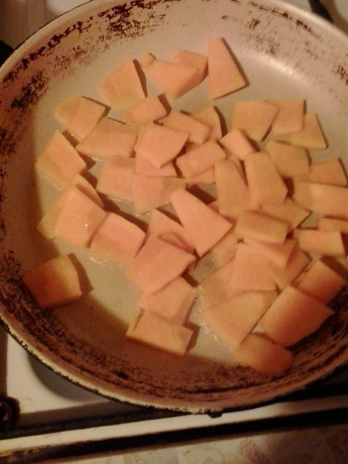 Тыкву нарезаем тонкими пластинами и слегка обжариваем на оливковом масле.