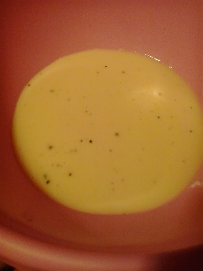 В миску выливаем сливки, добавляем к ним соль, перец свежемолотый и оставшиеся 2 яйца. Все хорошенько взбиваем.