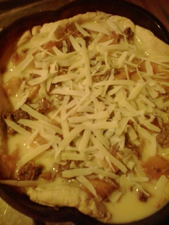 Достаем форму из духовки. На тесто выкладываем начинку и заливаем яичной смесью.