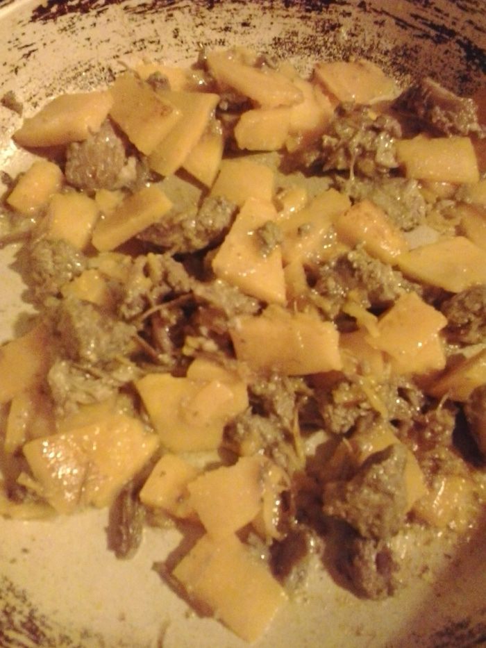 К тыкве добавляем тушенку и еще немного обжариваем.